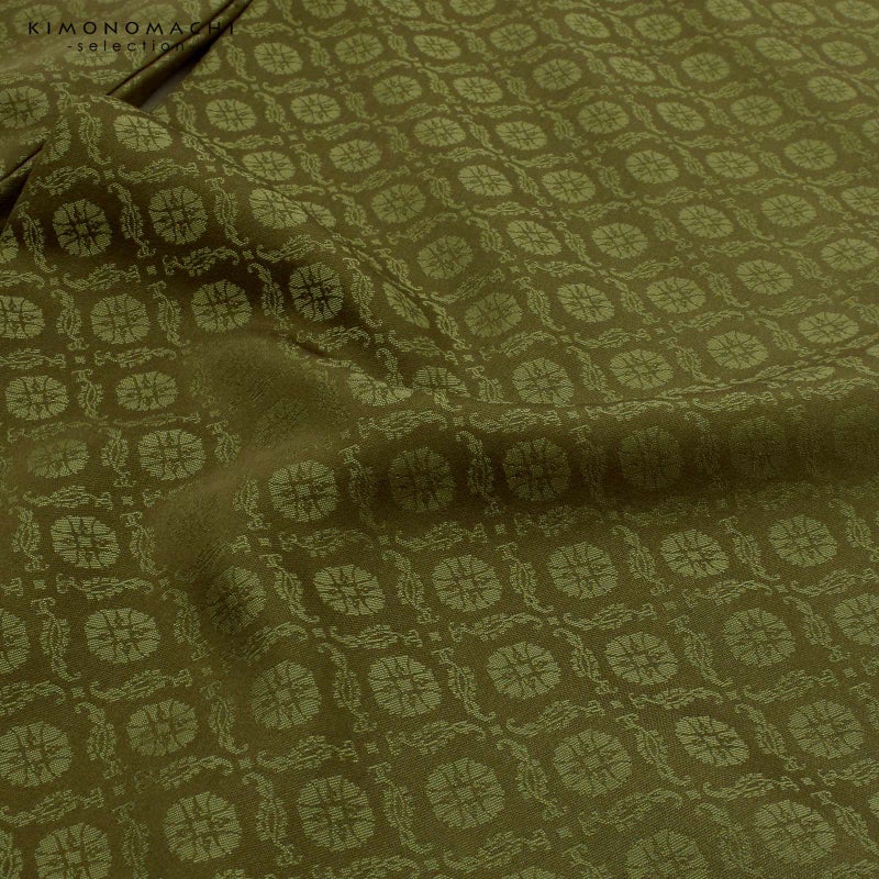 色は深い黄緑色。織りで表現された浮線綾の地模様が、光の当たり具合や着る人の動きによって浮かび上がります。