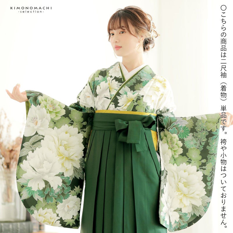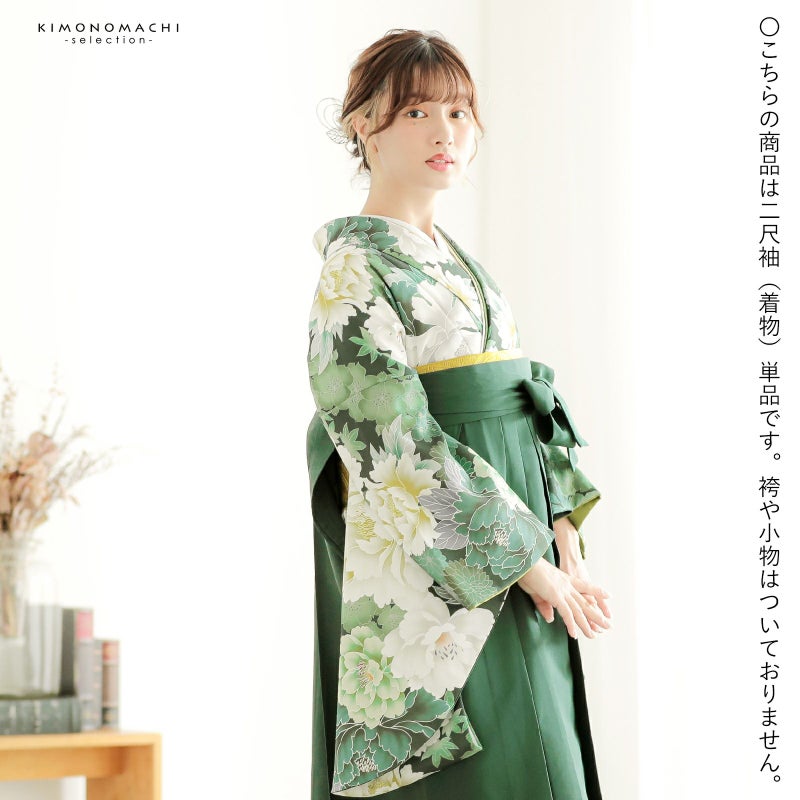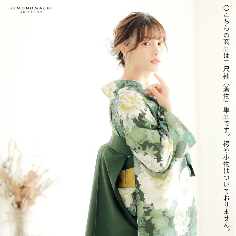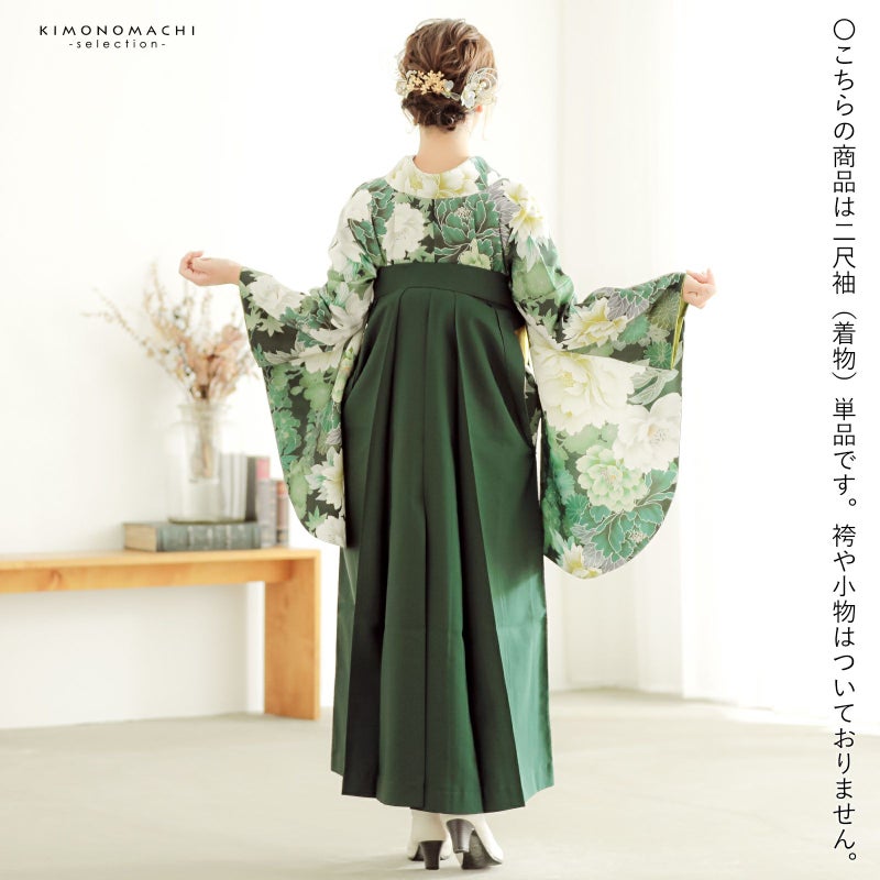 3. 二尺袖着物 単品「深緑色 牡丹に花々」お仕立て上がり レディース 洗える着物 二尺袖 着物 袴に合わせて 卒業式 謝恩会に【メール便不可】