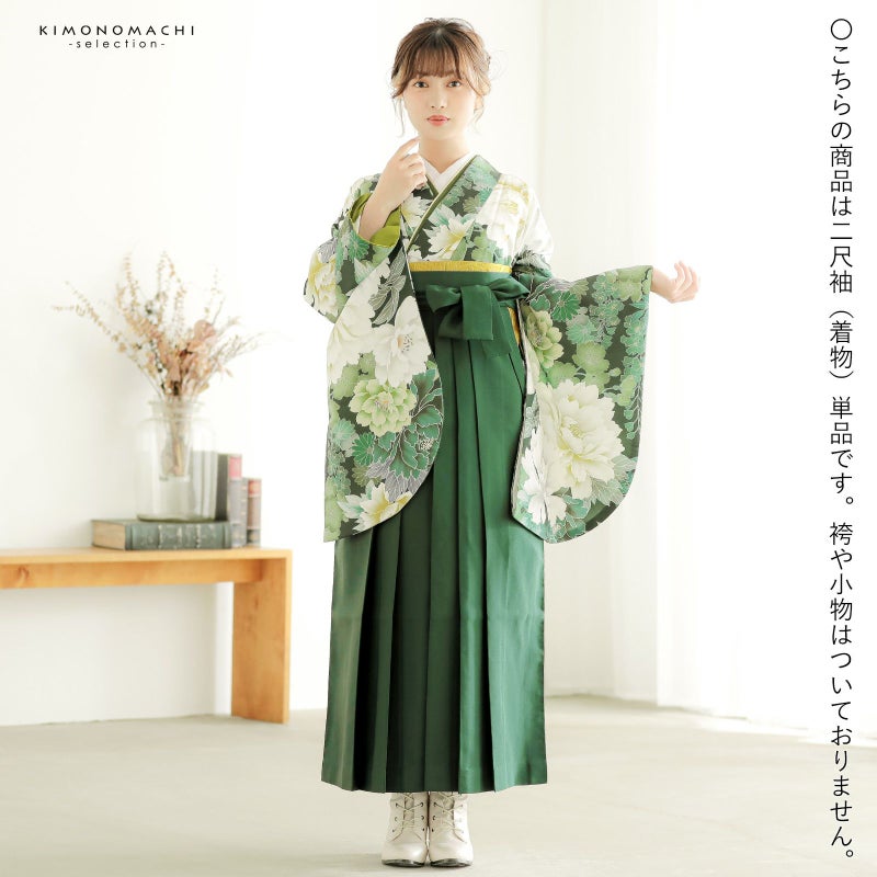 二尺袖着物 単品「深緑色 牡丹に花々」お仕立て上がり レディース 洗える着物 二尺袖 着物 袴に合わせて 卒業式 謝恩会に