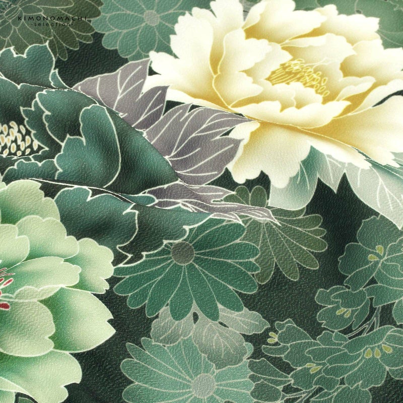 4. 二尺袖着物 単品「深緑色 牡丹に花々」お仕立て上がり レディース 洗える着物 二尺袖 着物 袴に合わせて 卒業式 謝恩会に【メール便不可】