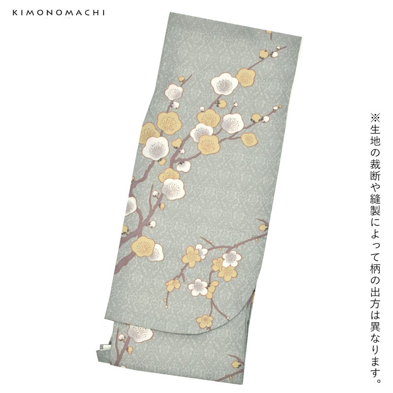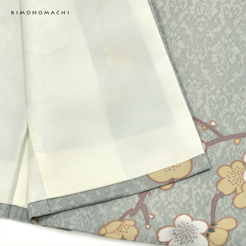 細かな地模様のある生地。わずかに青みのあるグレーの地に淡いグレーの細かなアラベスク文様。その上に光琳風のやわらかな形の梅の花が表現されています。ローズグレーの枝、淡い黄色とグレーぼかしの入った白の梅の花、萼の深い青緑が全体を引き締めています。古典的な枝梅を洗練された雰囲気に仕上げたデザインです。裏地は白。