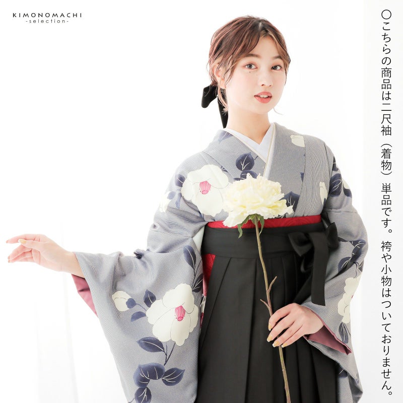5. (卒業式駆け込みSALE3/19迄)二尺袖着物 単品「縞に椿 グレー」お仕立て上がり レディース 洗える着物 二尺袖 着物 袴に合わせて 卒業式 謝恩会に【メール便不可】