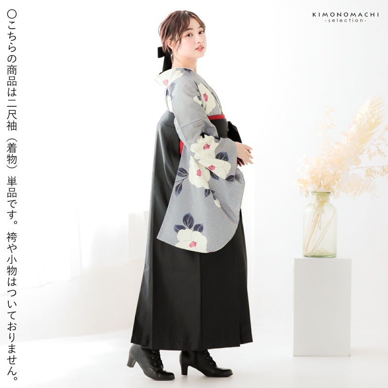 4. (卒業式駆け込みSALE3/19迄)二尺袖着物 単品「縞に椿 グレー」お仕立て上がり レディース 洗える着物 二尺袖 着物 袴に合わせて 卒業式 謝恩会に【メール便不可】