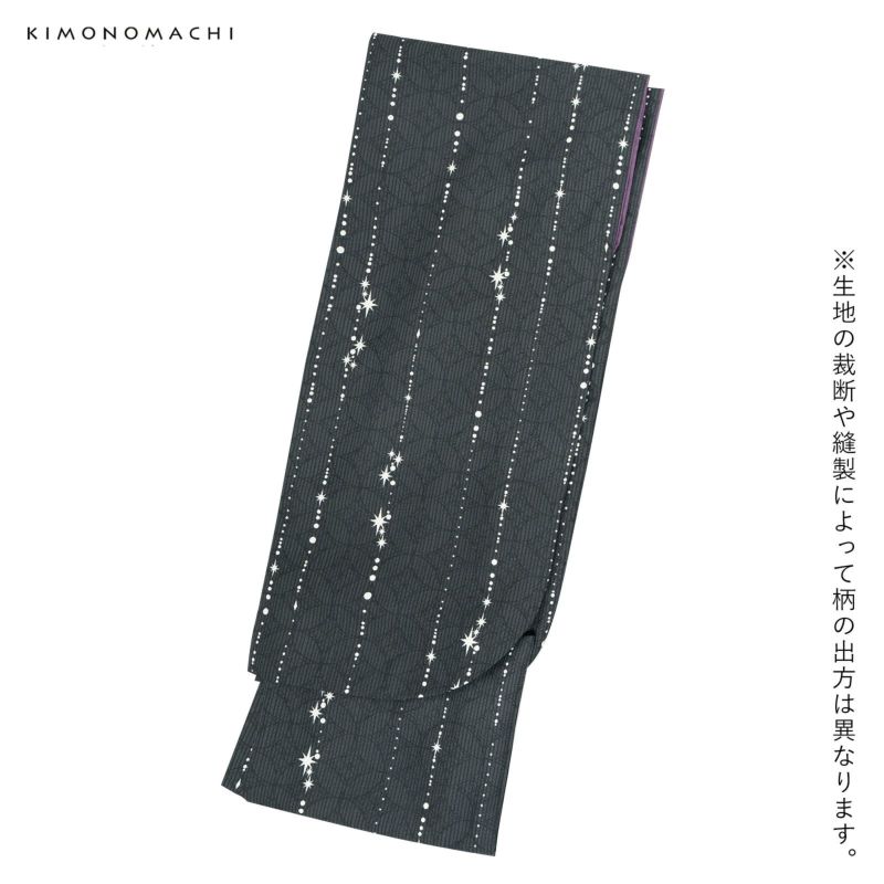 【色柄】墨色の地に黒の花七宝文様と細かな縞が全体に表現されています。その上に縦に配置された白の大小のドットや星。シックな配色とキラキラと零れ落ちる星くずのデザインがすっきりとした印象です。裏は紫。