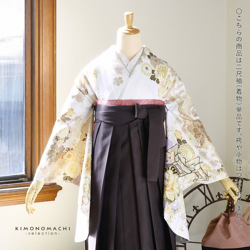 卒業式、謝恩会に 袴に合わせて華やかに 二尺袖着物 (卒業式応援Point10倍 3/5迄)二尺袖着物 単品 絵羽「白地 雲取りに四季花、御所車」Fサイズ お仕立て上がり 短丈 ショート丈 レディース 洗える着物 二尺袖 着物 袴に合わせて 卒業式 謝恩会【メール便不可】