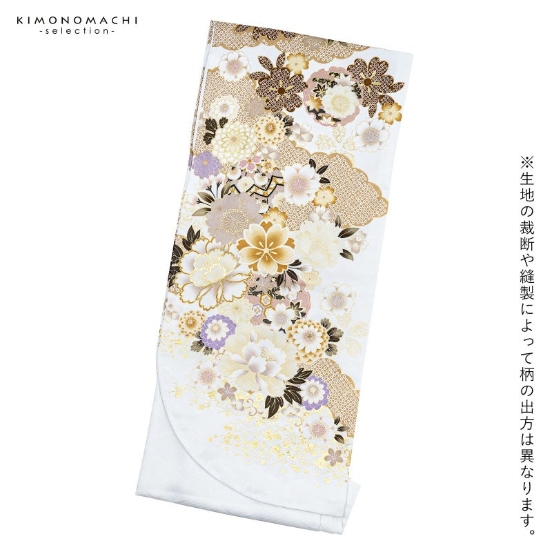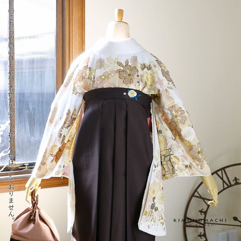 3. (卒業式応援Point10倍 3/5迄)二尺袖着物 単品 絵羽「白地 雲取りに四季花、御所車」Fサイズ お仕立て上がり 短丈 ショート丈 レディース 洗える着物 二尺袖 着物 袴に合わせて 卒業式 謝恩会【メール便不可】