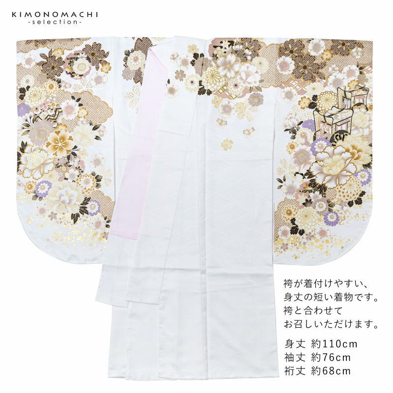 二尺袖着物 単品 絵羽「白地 雲取りに四季花、御所車」Fサイズ お仕立て上がり 短丈 ショート丈 レディース 洗える着物 二尺袖 着物 袴に合わせて 卒業式 謝恩会【メール便不可】