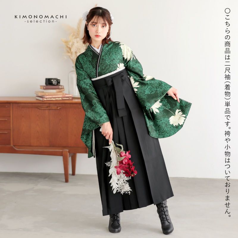 5. (卒業式応援Point10倍1/22迄)二尺袖着物 単品 半身変わり「クロムグリーン アラベスク、月花」Fサイズ お仕立て上がり 短丈 ショート丈 レディース 洗える着物 二尺袖 着物 袴に合わせて 卒業式 謝恩会【メール便不可】