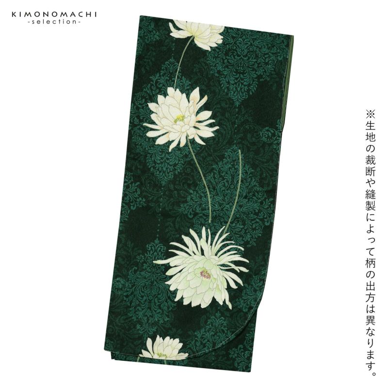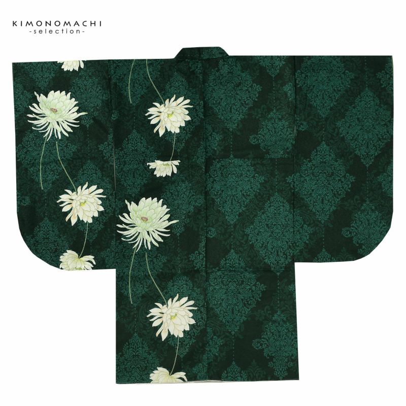 【色柄】ラメのような光沢のある深い青緑の地にアラベスク文様が全体に表現されています。上前側(左)の身頃と袖には、白に淡い黄緑、珊瑚色のぼかしが入った月下美人のようなお花。