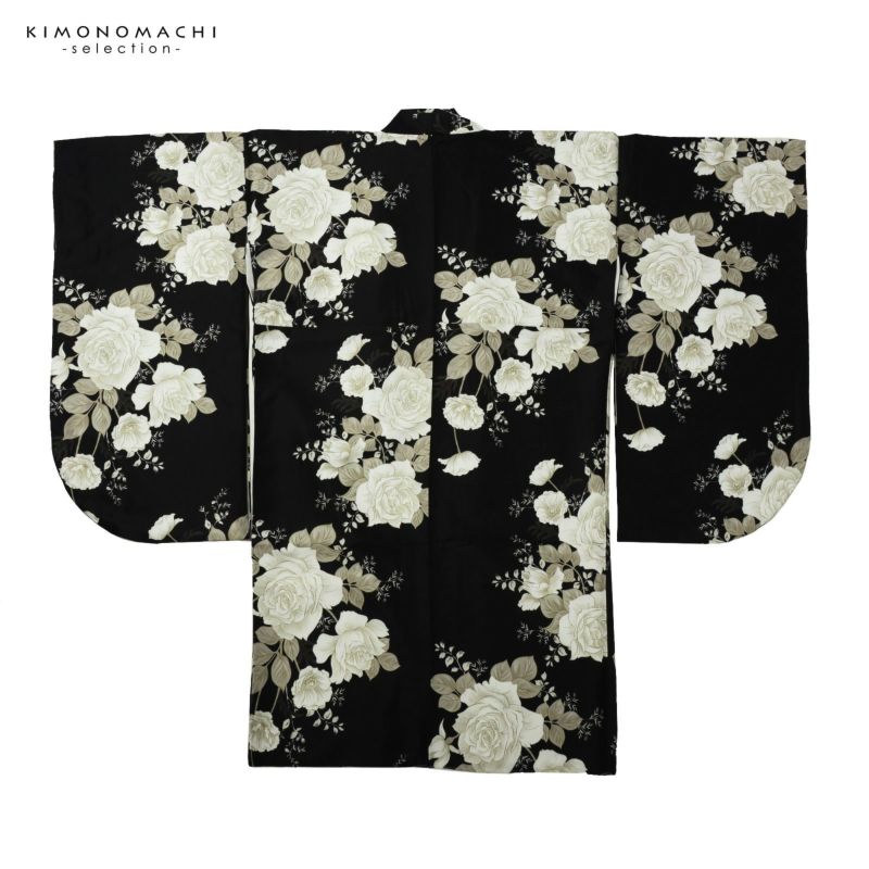 二尺袖着物 単品「黒地 オフホワイト、薔薇」Fサイズ お仕立て上がり 短丈 ショート丈 レディース 洗える着物 二尺袖 着物 袴に合わせて 卒業式 謝恩会【メール便不可】