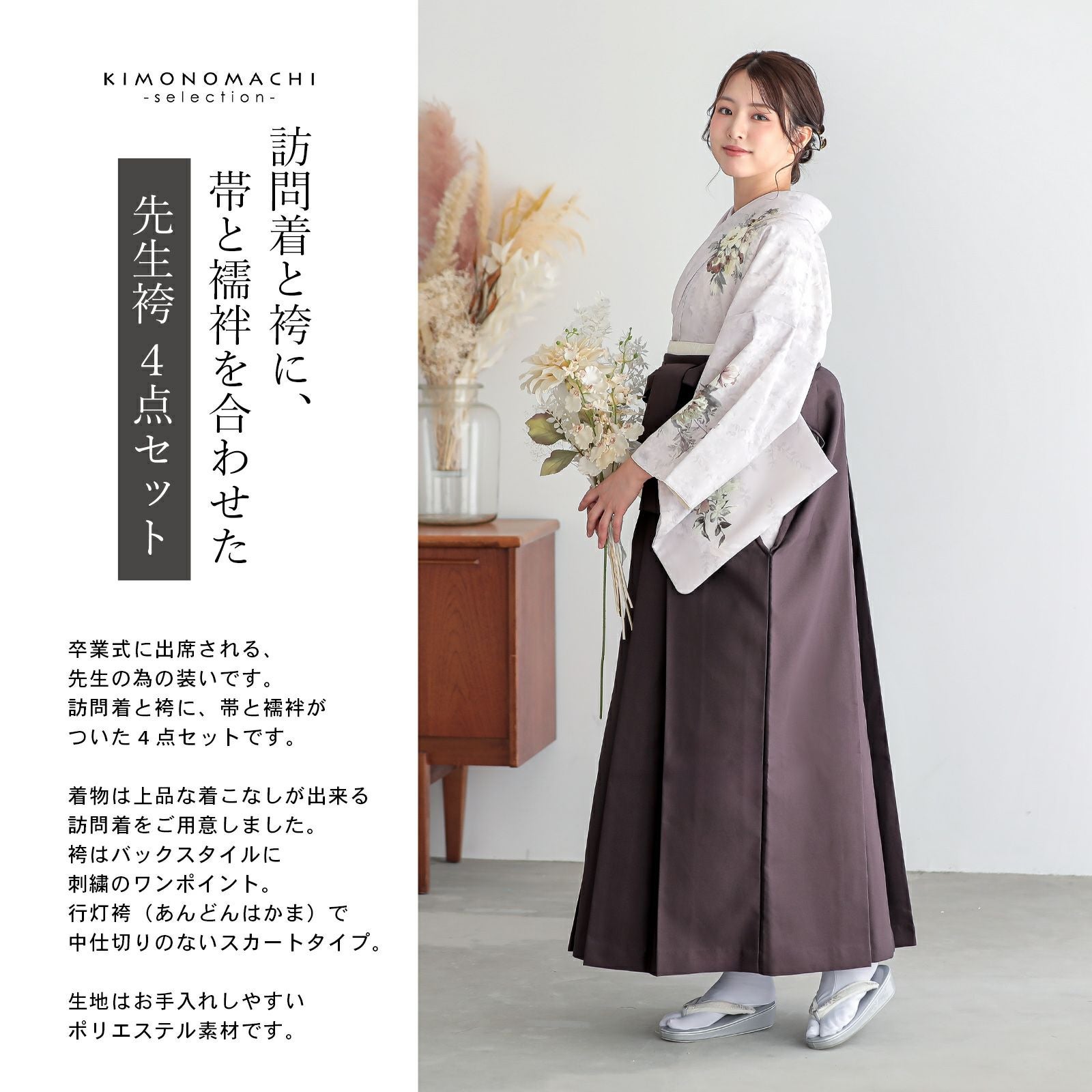 他の画像を見る 送料無料 訪問着と袴に、帯と襦袢を合わせた先生袴4点セット (卒業式応援75%SALE 3/5迄)先生袴 セット 4点セット「訪問着:ペールライラック ブーケ+袴:アンティークブラウン 椿+袴下帯:白 麻の葉+襦袢」卒業式 女性 レディース お仕立て上がり 袴セット 訪問着セット 着物 訪問着 袴 先生【メール便不可】 通常販売価格 ¥ 104,830 のところ きもの町価格 ¥ 89,105 税込 在庫切れ 販売期間 2026/02/19 18:00 〜 2026/03/05 17:59 カートに入れる お気に入りに登録する