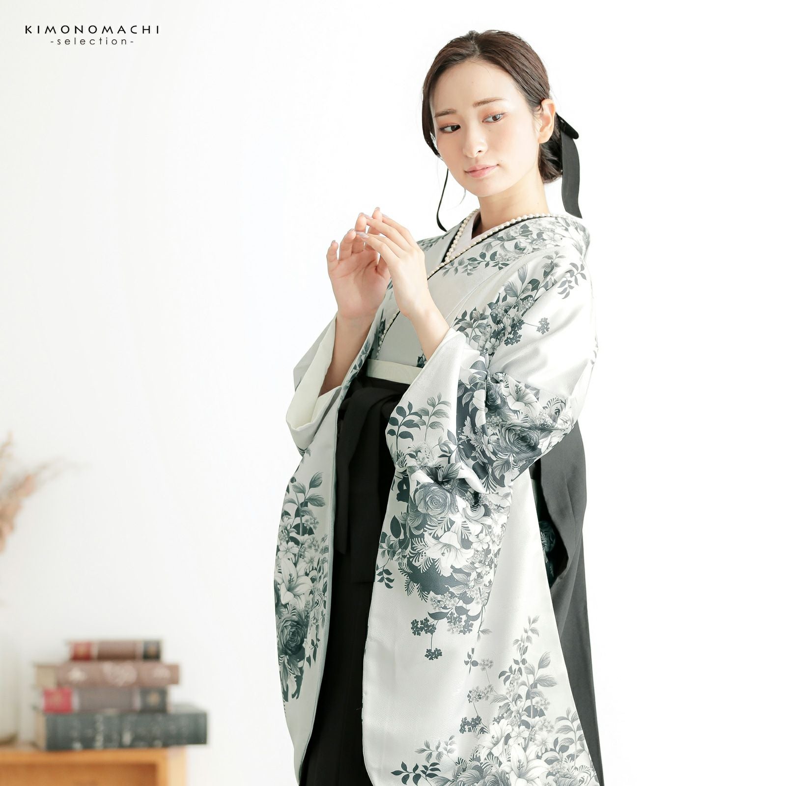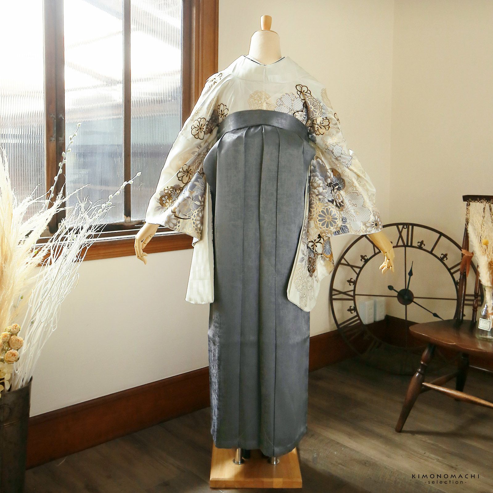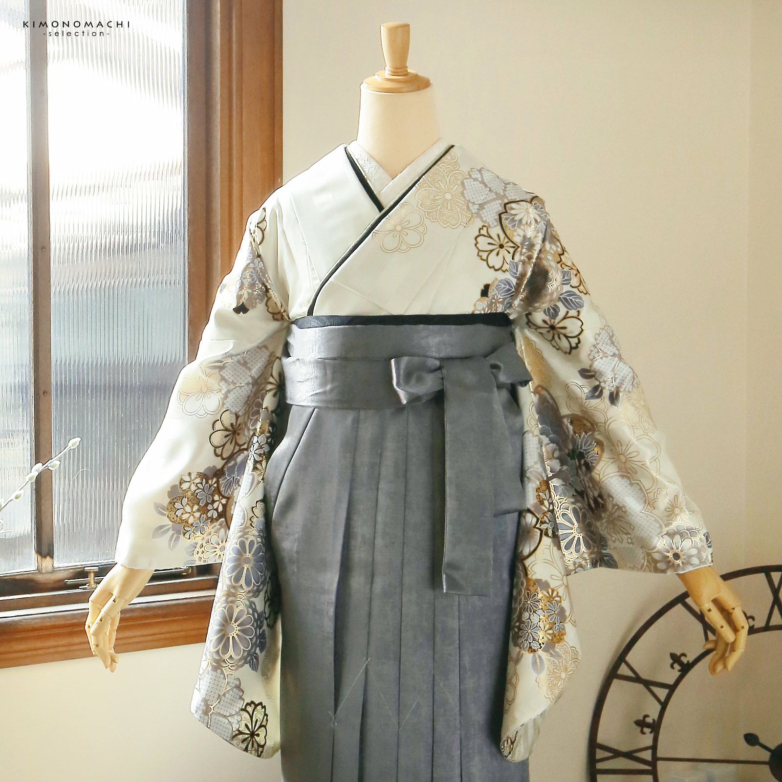 他の画像を見る 送料無料 卒業式に 二尺袖袴セット 卒業式 袴 レディース (卒業式応援75%SALE 3/5迄)袴 セット 卒業式 女性 4点セット「二尺袖:アイボリー地 銀鼠色、花紋+袴:箔風 銀+袴下帯:白 麻の葉+襦袢」卒業式 女性 レディース お仕立て上がり 袴セット 二尺袖着物セット 着物 二尺着物 袴【メール便不可】 通常販売価格 ¥ 77,770 のところ きもの町価格 ¥ 66,104 税込 販売期間 2026/02/19 18:00 〜 2026/03/05 17:59 カートに入れる お気に入りに登録する
