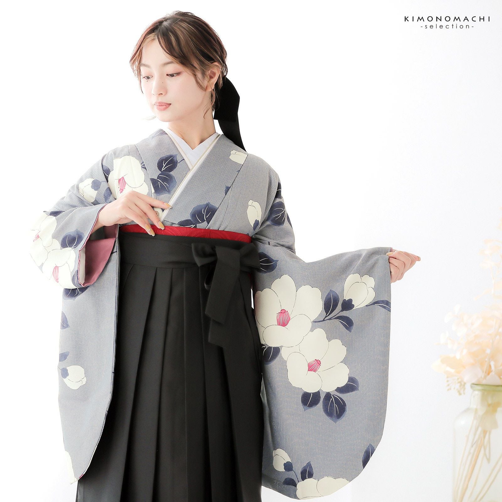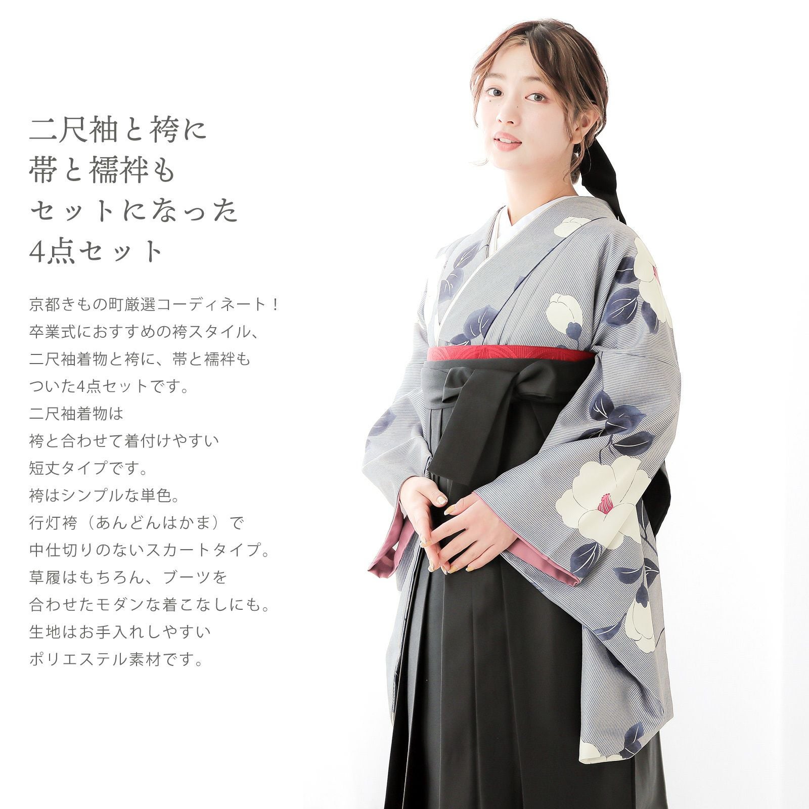 他の画像を見る 送料無料 卒業式に 二尺袖袴セット 卒業式 袴 レディース (卒業式応援75%SALE 3/5迄)袴 セット 卒業式 女性 4点セット「二尺袖:縞に椿 グレー+袴:黒+袴下帯:レッド 麻の葉+襦袢」卒業式 女性 レディース お仕立て上がり 袴セット 二尺袖着物セット 着物 二尺着物 袴【メール便不可】 通常販売価格 ¥ 38,060 のところ きもの町価格 ¥ 32,351 税込 販売期間 2026/02/19 18:00 〜 2026/03/05 17:59 カートに入れる お気に入りに登録する