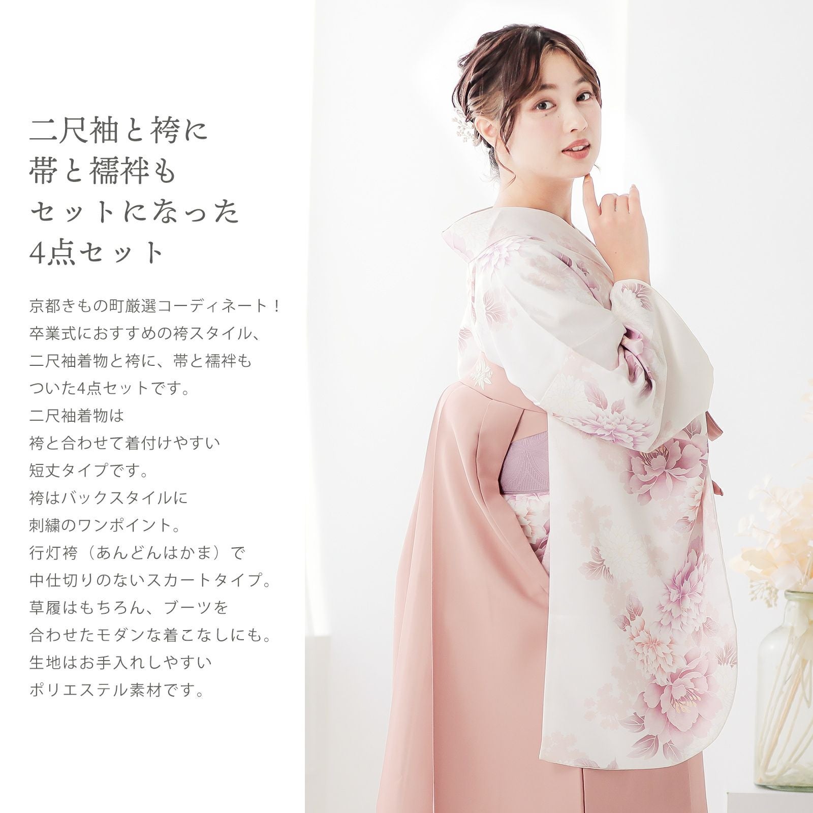 他の画像を見る 送料無料 卒業式に 二尺袖袴セット 卒業式 袴 レディース (卒業式応援75%SALE 3/5迄)袴 セット 卒業式 女性 4点セット「二尺袖:牡丹に菊 パールピンク+袴:スモーキーピンク 南天+袴下帯:ダルパープル 麻の葉+襦袢」卒業式 女性 レディース お仕立て上がり 袴セット 二尺袖着物セット 着物 二尺着物 袴【メール便不可】 通常販売価格 ¥ 46,420 のところ きもの町価格 ¥ 34,622 税込 販売期間 2026/02/19 18:00 〜 2026/03/05 17:59 カートに入れる お気に入りに登録する