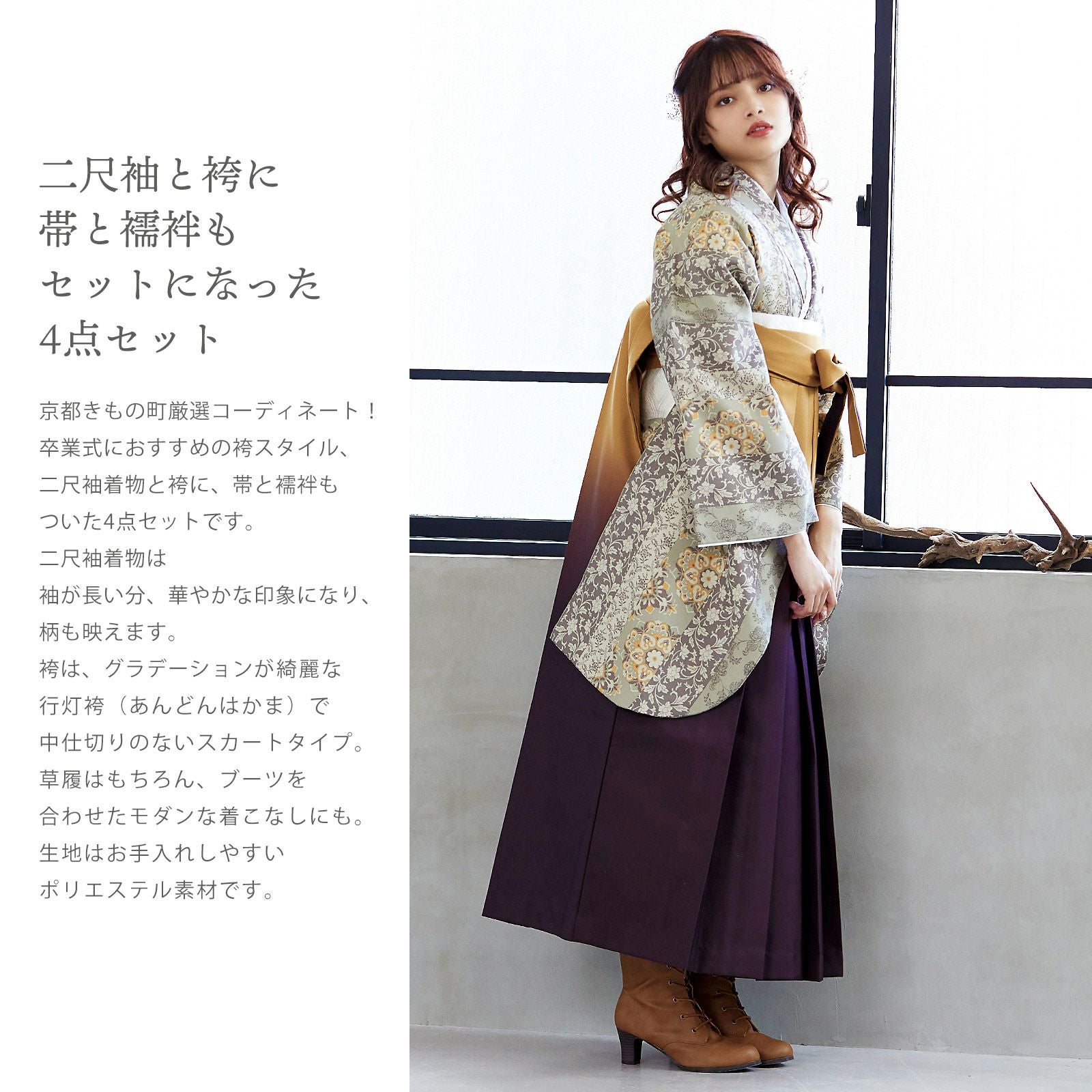 他の画像を見る 送料無料 卒業式に 二尺袖袴セット 卒業式 袴 レディース (卒業式応援75%SALE 3/5迄)袴 セット 卒業式 女性 4点セット「二尺袖:ミモザに立涌 錆青磁色+袴:オフホワイト 葡萄+袴下帯:イエローオーカー 麻の葉+襦袢」卒業式 女性 レディース お仕立て上がり 袴セット 二尺袖着物セット 着物 二尺着物 袴【メール便不可】 通常販売価格 ¥ 41,470 のところ きもの町価格 ¥ 28,600 税込 販売期間 2026/02/19 18:00 〜 2026/03/05 17:59 カートに入れる お気に入りに登録する