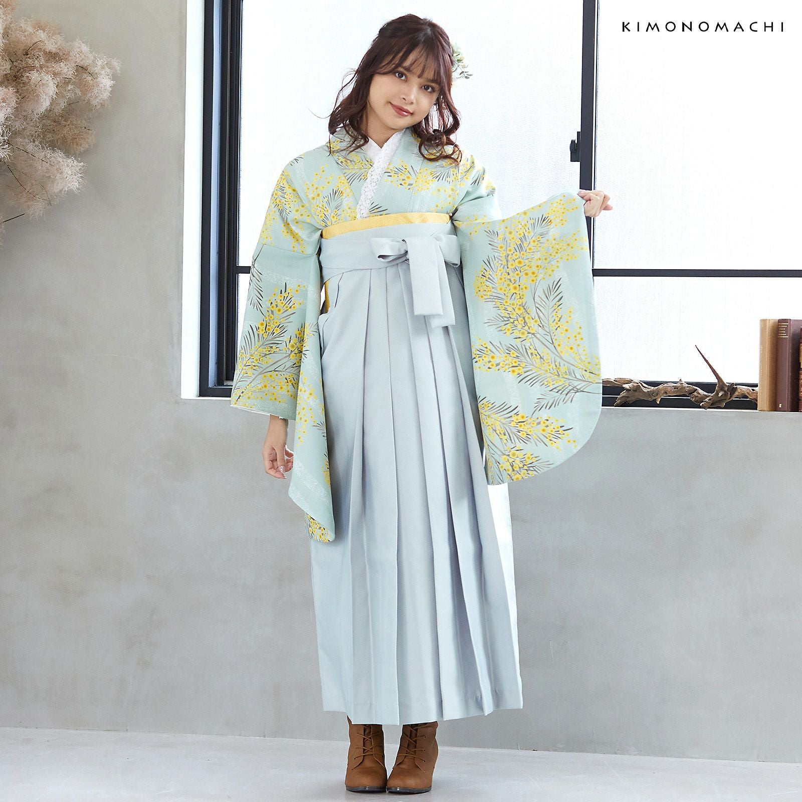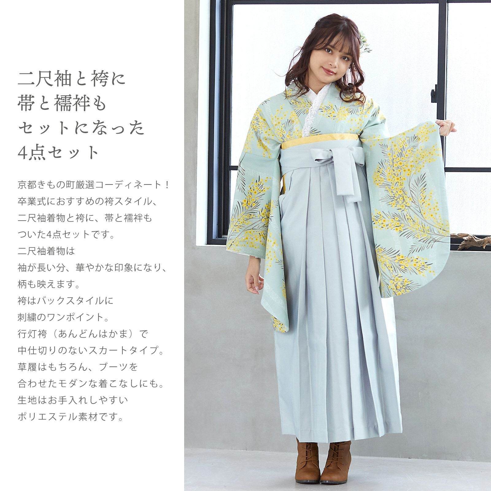 他の画像を見る 送料無料 卒業式に 二尺袖袴セット 卒業式 袴 レディース (卒業式応援75%SALE 3/5迄)袴 セット 卒業式 女性 4点セット「二尺袖:ミモザに立涌 錆青磁色+袴:アイスグレー 椿の刺繍+袴下帯:イエローオーカー 麻の葉+襦袢」卒業式 女性 レディース お仕立て上がり 袴セット 二尺袖着物セット 着物 二尺着物 袴【メール便不可】 通常販売価格 ¥ 41,470 のところ きもの町価格 ¥ 28,600 税込 販売期間 2026/02/19 18:00 〜 2026/03/05 17:59 カートに入れる お気に入りに登録する