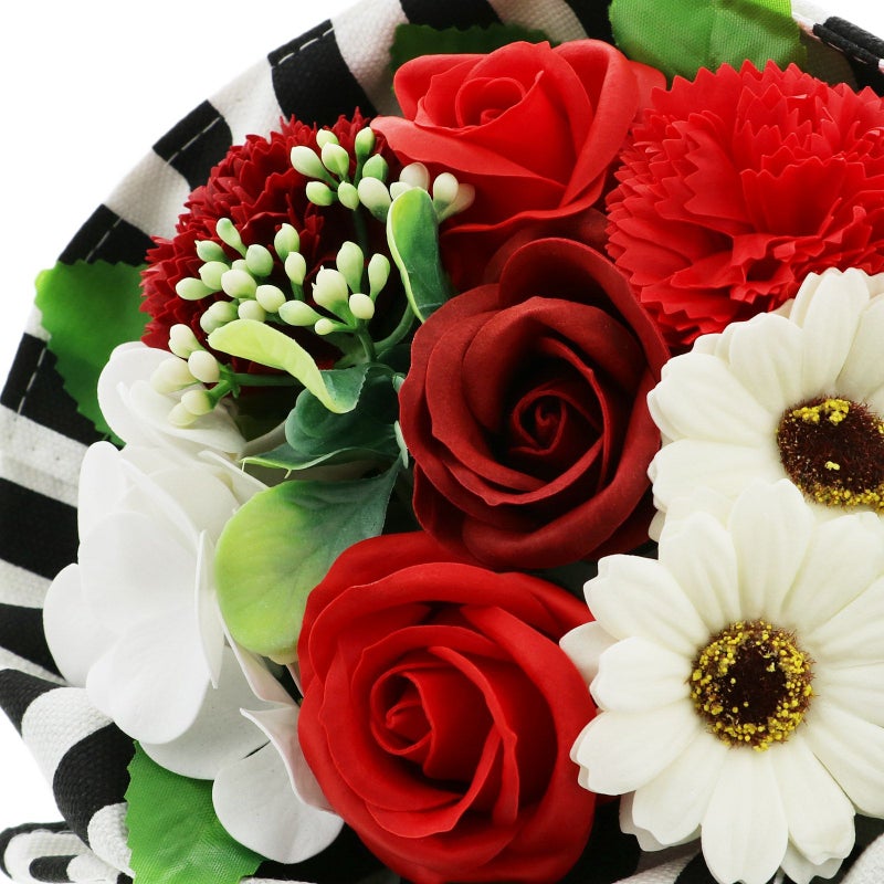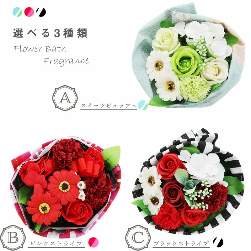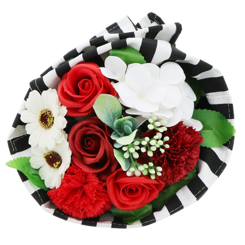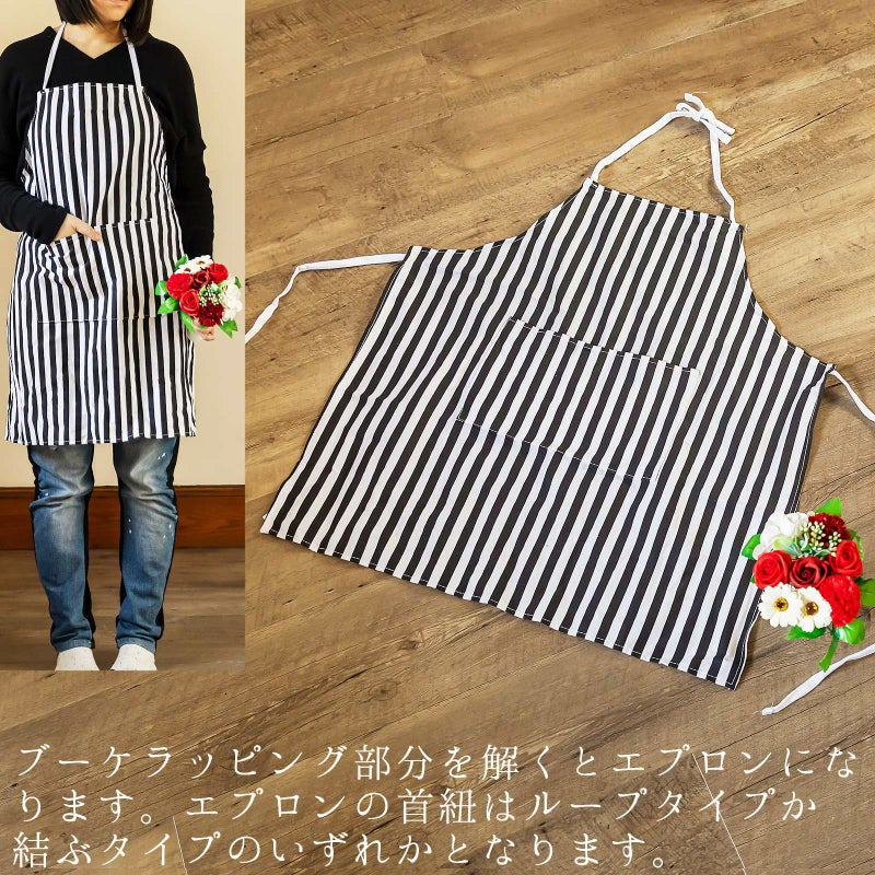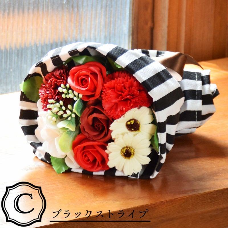 C. ブラックストライプ…花々のバスフレグランスを、エプロンでラッピングしたブーケ。フレグランスは、深い赤系のローズやカーネーション、白のアジサイやガーベラなど。エプロンは白黒のストライプの柄です。