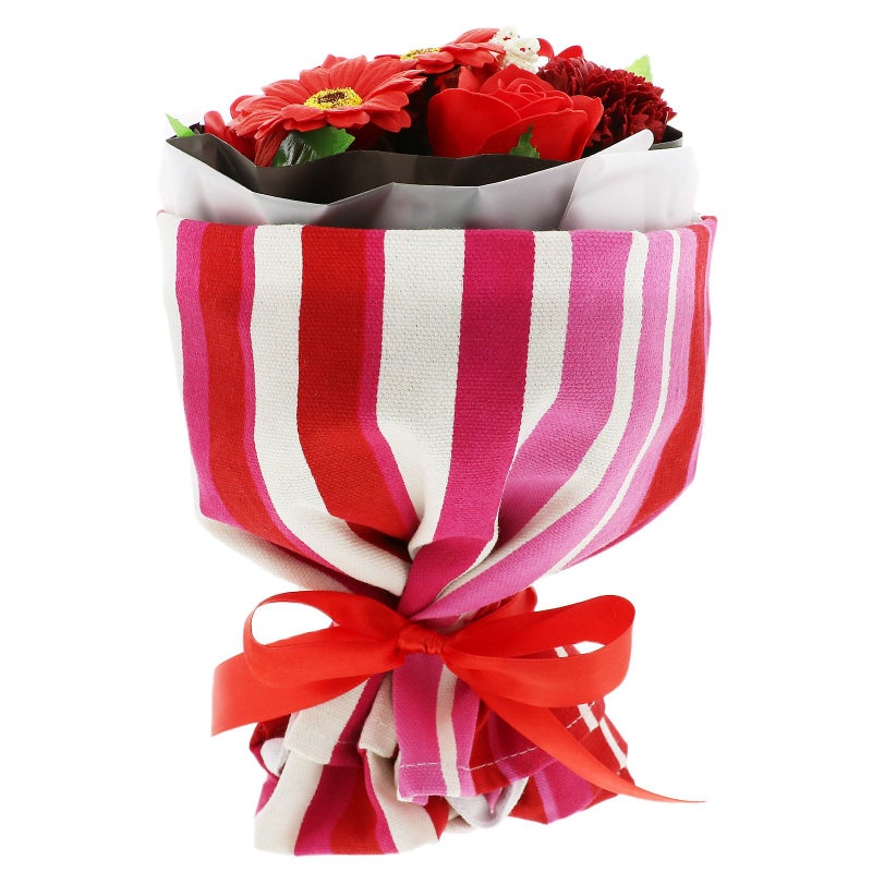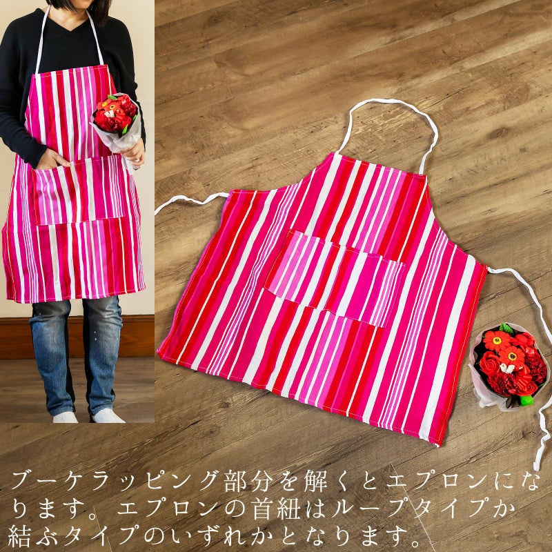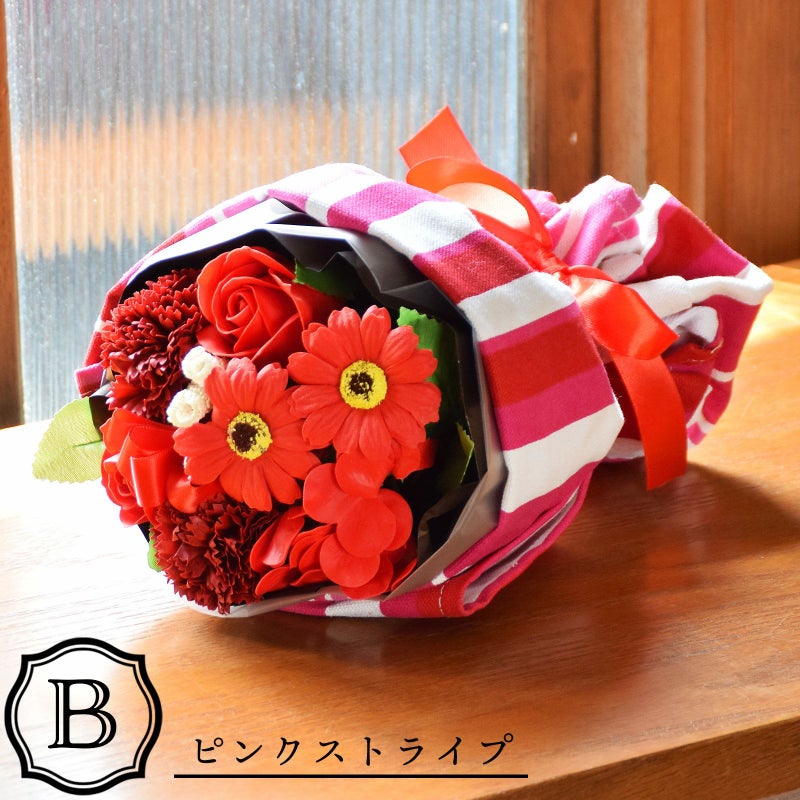 B. ピンクストライプ…花々のバスフレグランスを、エプロンでラッピングしたブーケ。フレグランスは、深い赤系のローズやカーネーション、明るい赤のアジサイやガーベラなど。エプロンはマゼンタピンクと白のストライプの柄です。