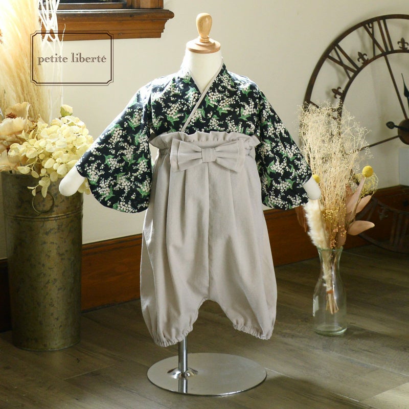 【色柄】着物は黒地に白とベージュ、緑のスズラン模様。浅いベージュの重ね衿。袴はグレイッシュなベージュ。