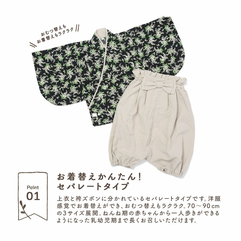 上衣と袴ズボンに分かれているセパレートタイプです。洋服感覚でお着替えができ、おむつ替えもラクラク。