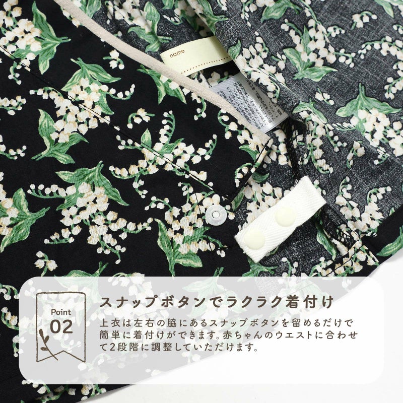上衣は左右の脇にあるスナップボタンを留めるだけで簡単に着付けができます。赤ちゃんのウエストに合わせて2段階に調整していただけます。