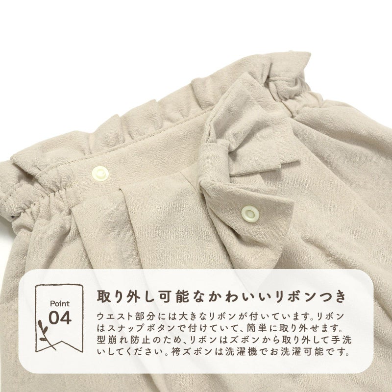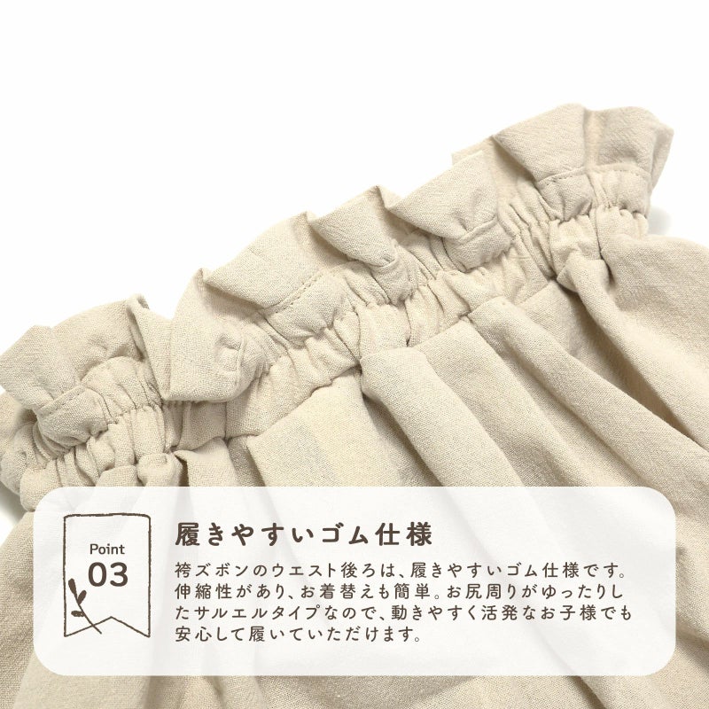 お尻周りがゆったりしたサルエルタイプなので、動きやすく活発なお子様でも安心して履いていただけます。