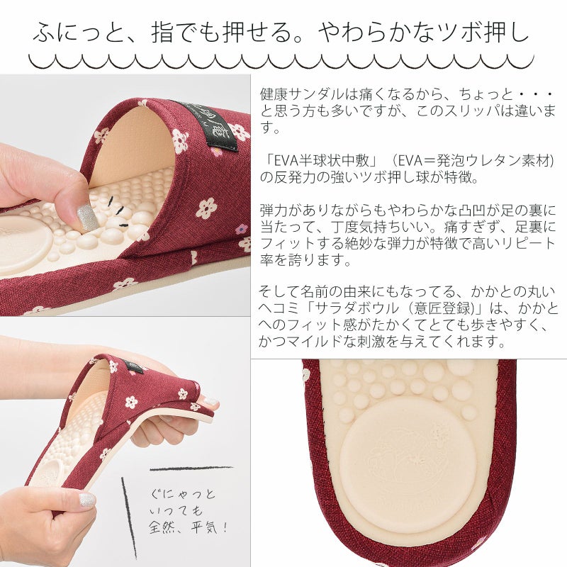 今まで健康スリッパは痛くて履けなかった人に好評をいただいている「サラダボールシリーズ」の和柄スリッパです。