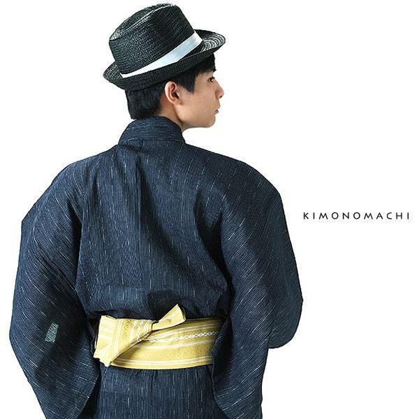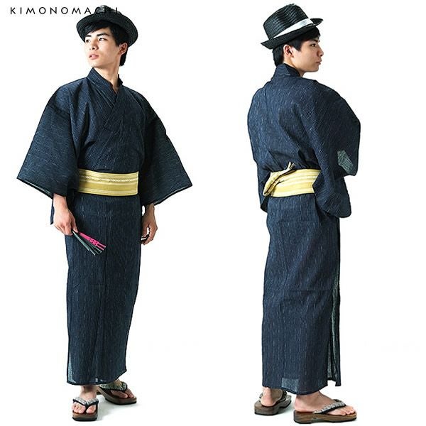 【Prices down】男性浴衣2点セット「紺色細縞浴衣×からし色献上柄角帯」S、M、L、LL 男性浴衣、角帯 花火大会、夏祭り、夏フェスに しじら浴衣 男性浴衣セット 【メール便不可】