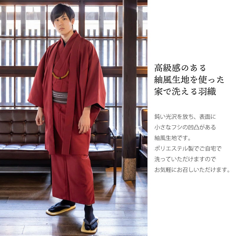 羽織 男性 メンズ 洗える着物 単品 「エンジ 紬風」 はおり 男着物 男性用着物 男性着物 メンズ着物 お仕立て上がり ポリエステル着物 男羽織 プレタ着物 男着物単品 mens kimono haori 【メール便不可】
