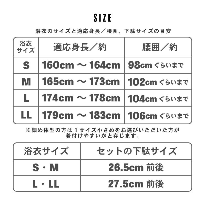 下駄:浴衣S/Mサイズ…26.5cm前後、浴衣L/LLサイズ…27.5cm前後