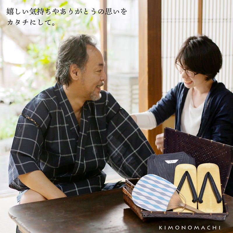 【商品内容】甚平1点(上着とズボンのセット)とうちわと雪駄(鼻緒柄おまかせ)のセット、竹籠入り・梅熨斗ラッピング付き