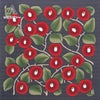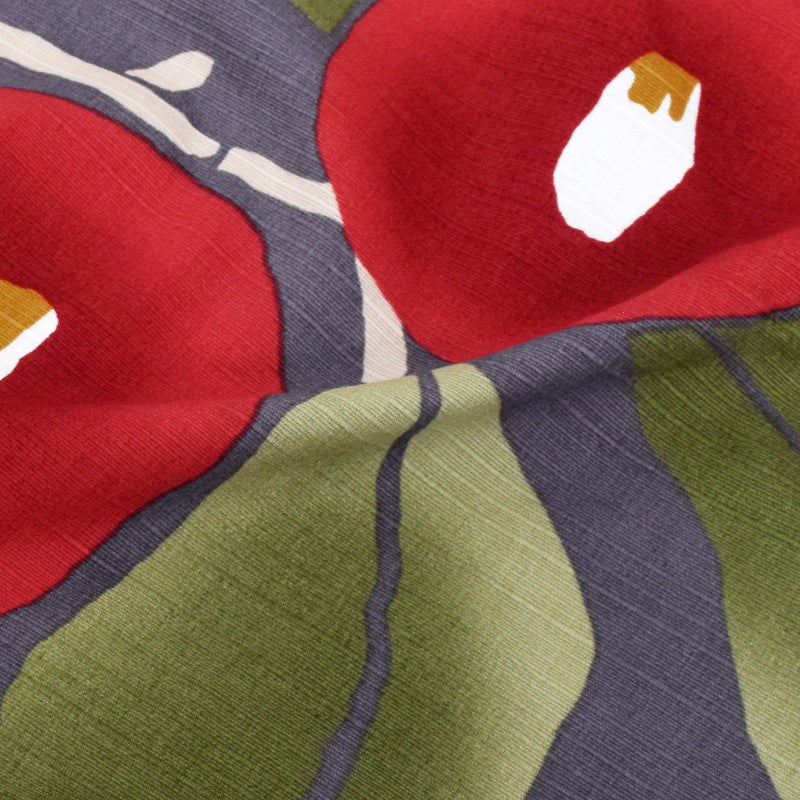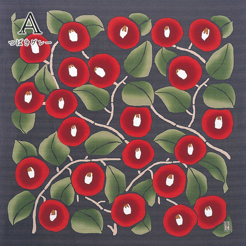 A.つばき グレー・・・やや紫みのグレーの地に深い赤の椿と深い黄緑の葉、ベージュの枝。シックな色合いですが、抽象的な丸い形とやわらかなぼかしが可愛らしい印象です。