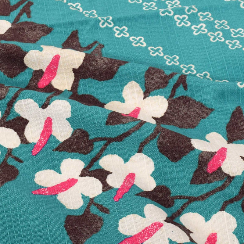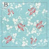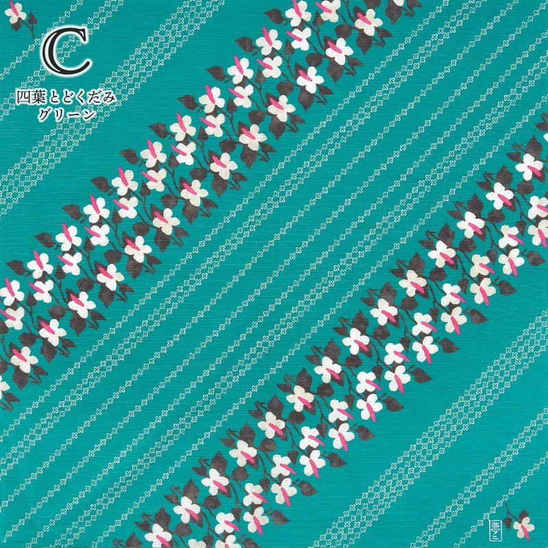 C.四つ葉とどくだみ グリーン・・・ターコイズ系のグリーンの地に、どくだみの花と小さな四つ葉を横段に配置したデザイン。チャコールの葉、白の花にピンクの花芯がアクセントです。