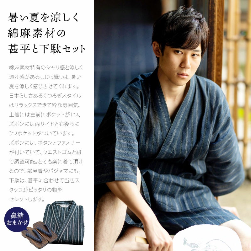 【商品内容】甚平1点(上着とズボンのセット)と下駄(鼻緒柄おまかせ)の2点セット
