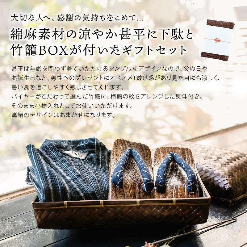 【商品内容】甚平1点(上着とズボンのセット)と下駄(鼻緒柄おまかせ)のセット、竹籠入り・梅熨斗ラッピング付き