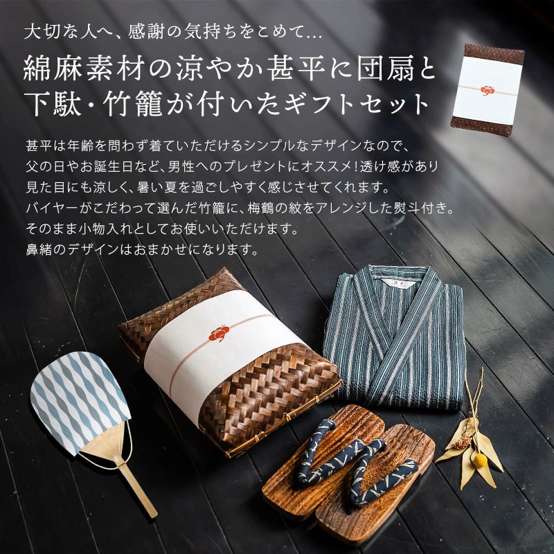 【商品内容】甚平1点(上着とズボンのセット)とうちわと下駄(鼻緒柄おまかせ)のセット、竹籠入り・梅熨斗ラッピング付き