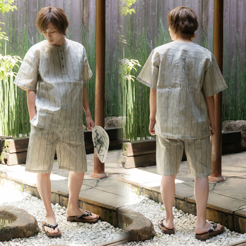 【商品内容】ヘンリーネック甚平1点(上着とズボンのセット)と雪駄(鼻緒柄おまかせ)の2点セット