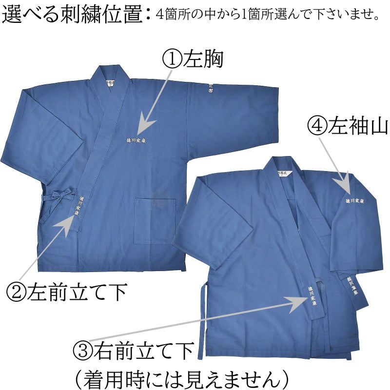 左胸・左前立て下・右前立て下・左袖山の4か所の中からいずれか一か所に、お名前の刺繍を入れていただけます。