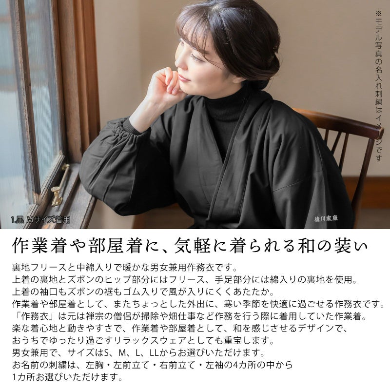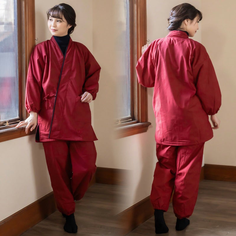 裏地フリースと中綿入りで暖かな男女兼用作務衣です。上着、ズボンの上下に分かれています。