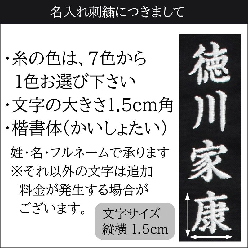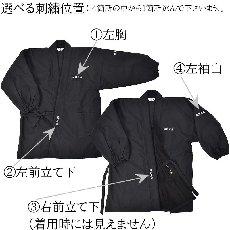 左胸・左前立て下・右前立て下・左袖山の4か所の中からいずれか一か所に、お名前の刺繍を入れていただけます。