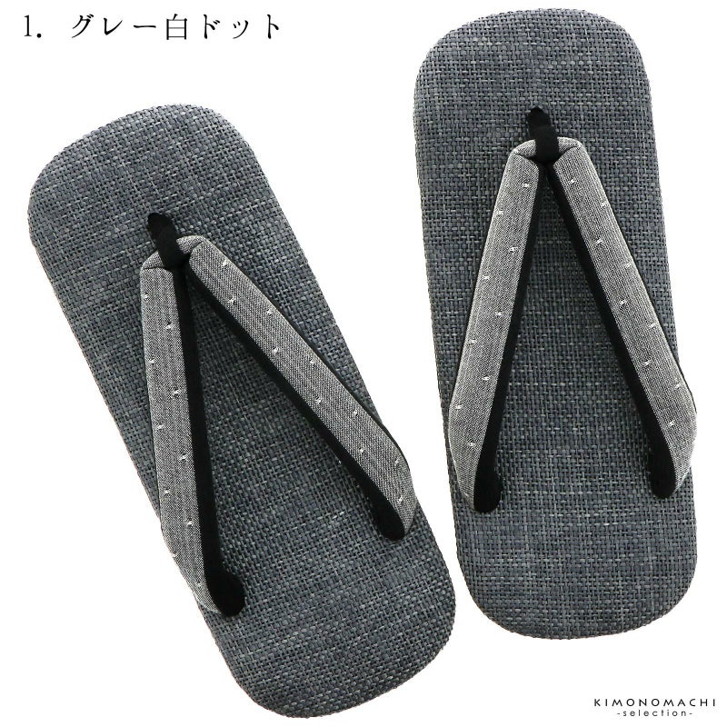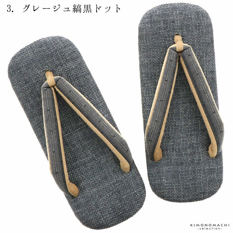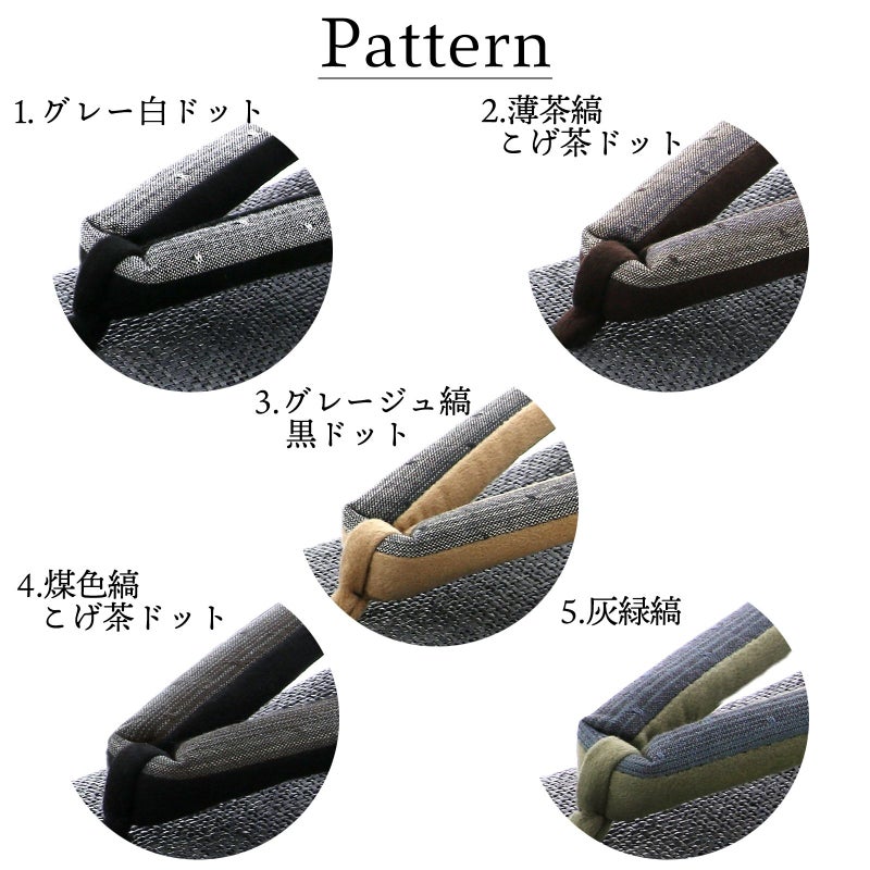 1.グレー、白ドット…鼻緒は杢のグレー地に、白の浮織の小さいドット。前坪と裏地は黒。足をのせる天の部分は濃グレーのラタンメッシュ。芯はコルク。カジュアルでありながら上品な印象です。