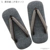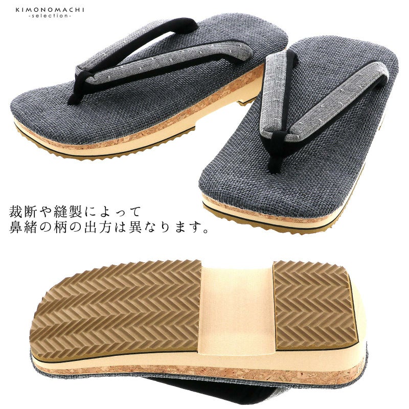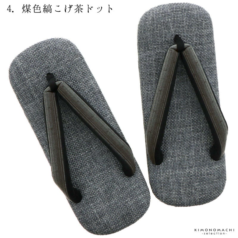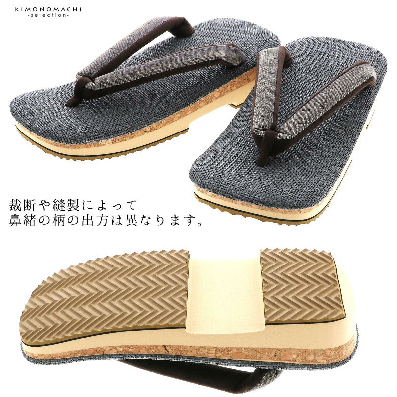 4.煤色縞、こげ茶ドット…鼻緒は浅いチャコール系の縞の地に、こげ茶色の浮織の小さいドット。前坪と裏地は黒。足をのせる天の部分は濃グレーのラタンメッシュ。芯はコルク。