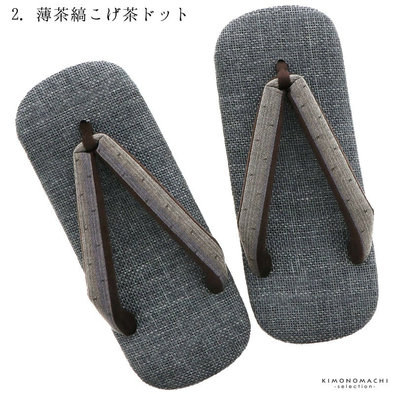 2.薄茶縞、こげ茶ドット…鼻緒は浅い茶系の縞の地に、こげ茶色の浮織の小さいドット。前坪と裏地はこげ茶。足をのせる天の部分は濃グレーのラタンメッシュ。芯はコルク。カジュアルかつ粋な印象です。