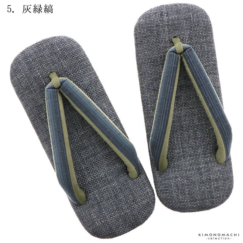 5.灰緑縞…鼻緒はグレイッシュな青緑色の地に、浅い茶色の縞。前坪と裏地は抹茶色。足をのせる天の部分は濃グレーのラタンメッシュ。芯はコルク。