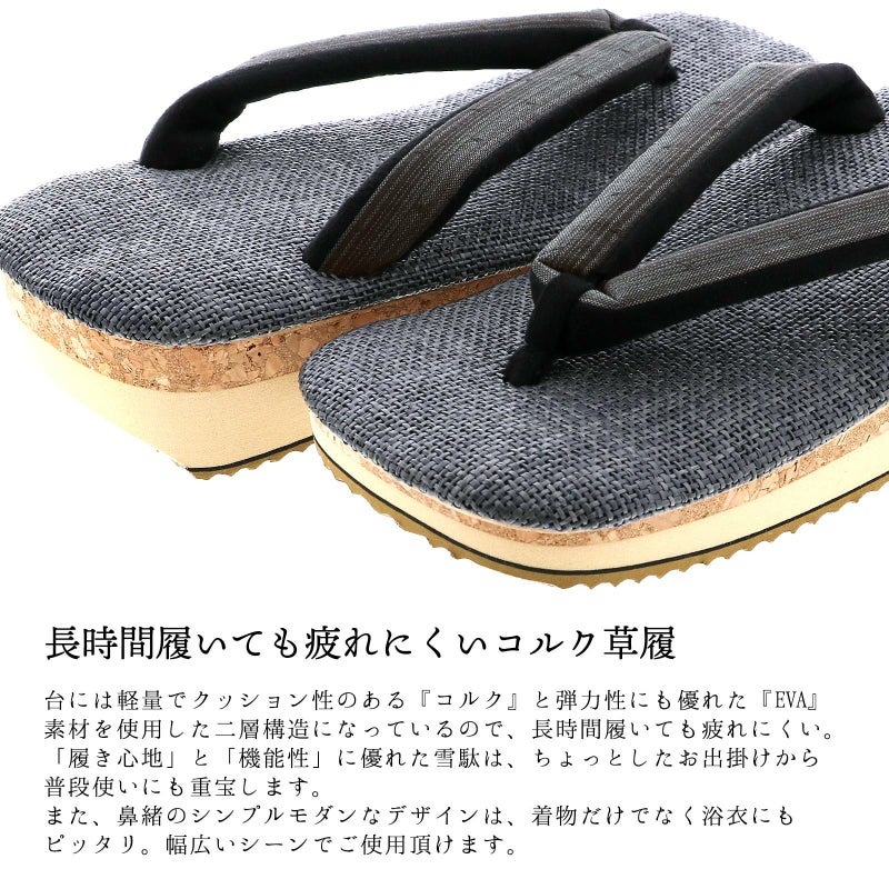 土台に軽量でクッション性のある『コルク』と、弾力性にも優れた『EVA』素材を使用した二層構造の草履です。