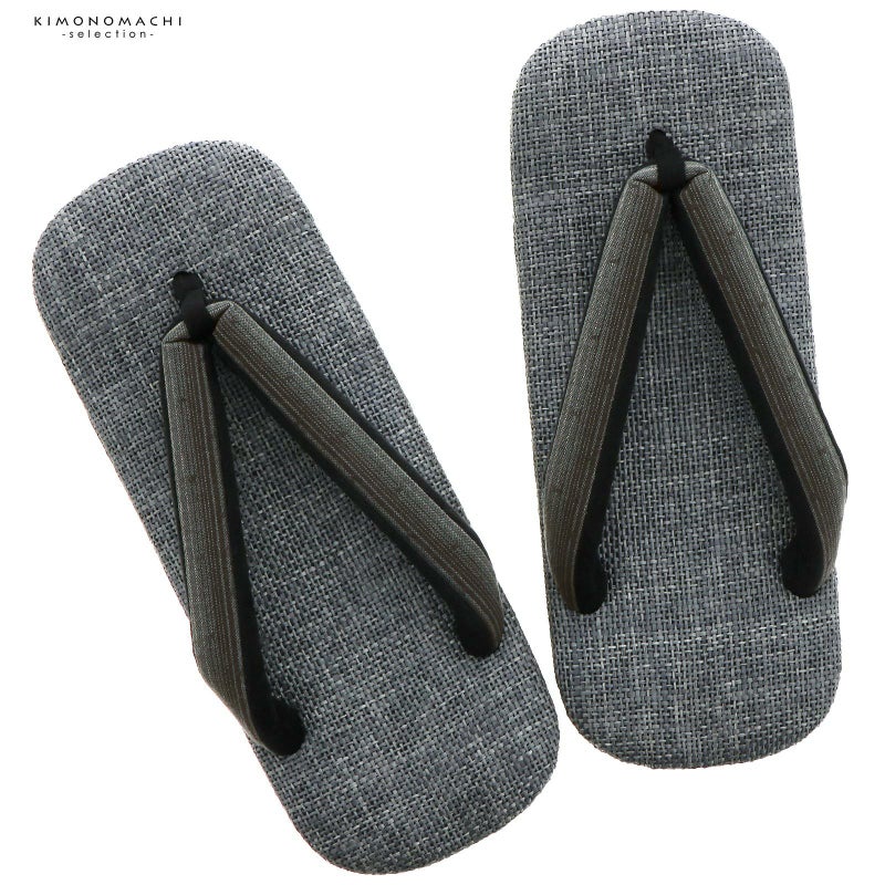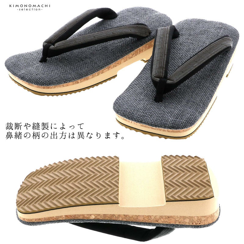 鼻緒は浅いチャコール系の縞の地に、こげ茶色の浮織の小さいドット。前坪と裏地は黒。足をのせる天の部分は濃グレーのラタンメッシュ。芯はコルク。