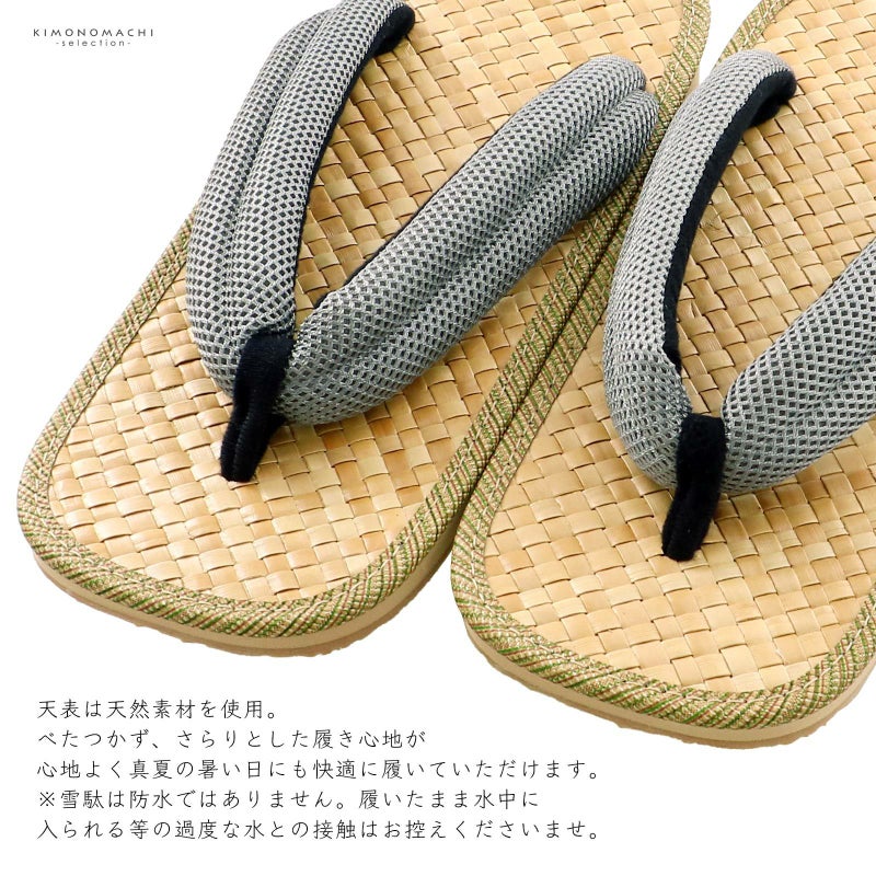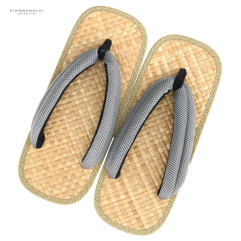 【色柄】鼻緒はグレーのメッシュ素材。前坪と裏地は黒。足をのせる天の部分は竹籠のような編地。