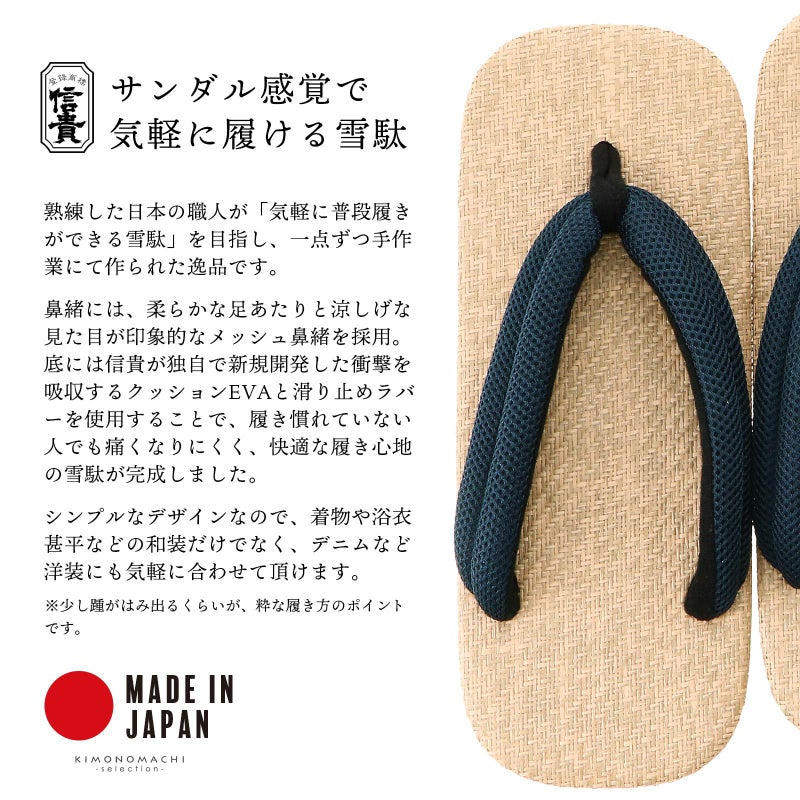 底には信費が独自で新規開発した衝撃を吸収するクッションEVAと滑り止めラバーを使用することで、履き慣れていない人でも痛くなりにくく、快適な履き心地の雪駄が完成しました。
