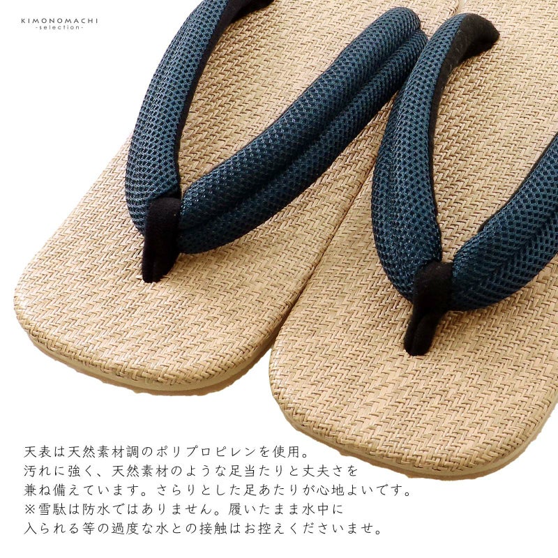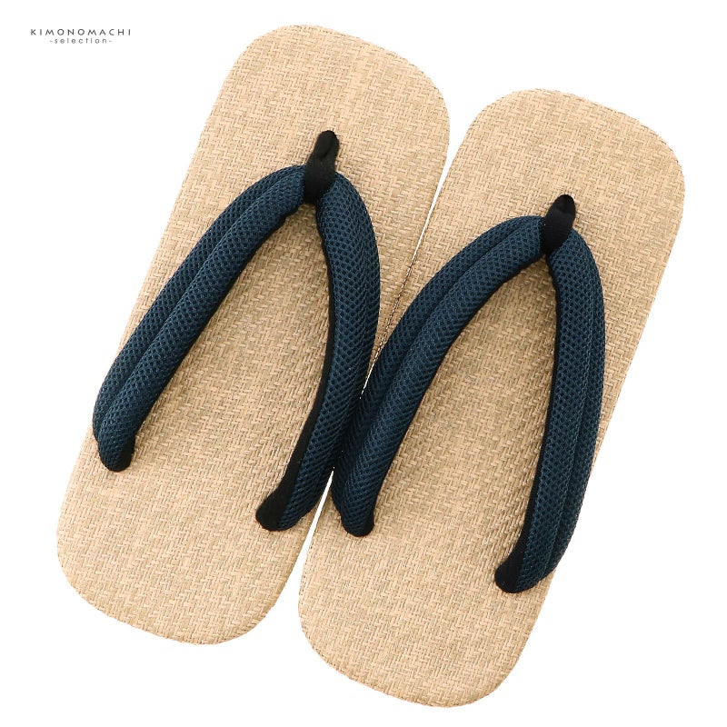 【色柄】鼻緒は紺のメッシュ素材。前坪と裏地は黒。足をのせる天の部分はゴザのような編地。