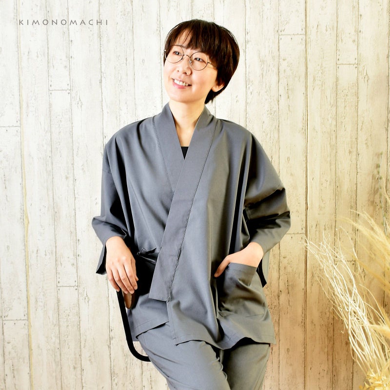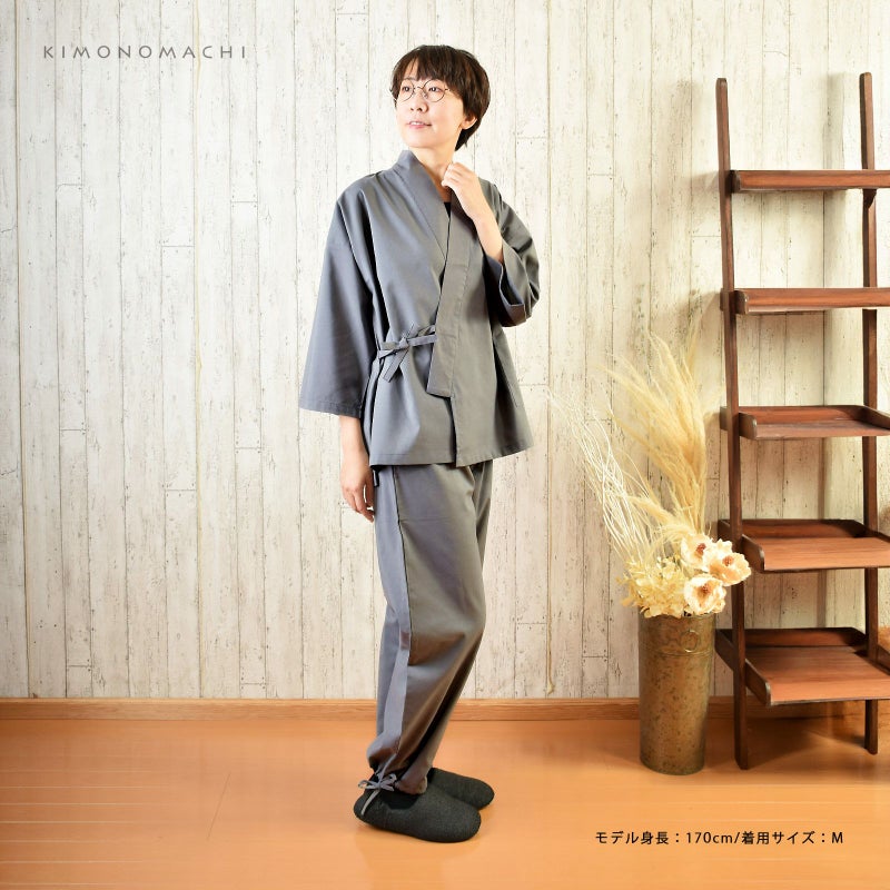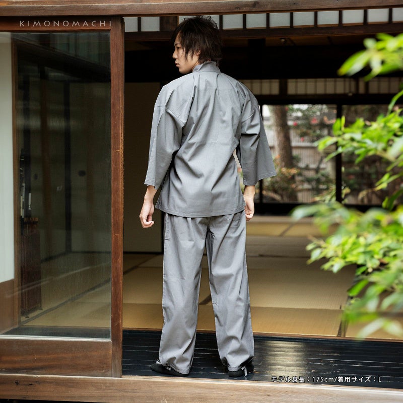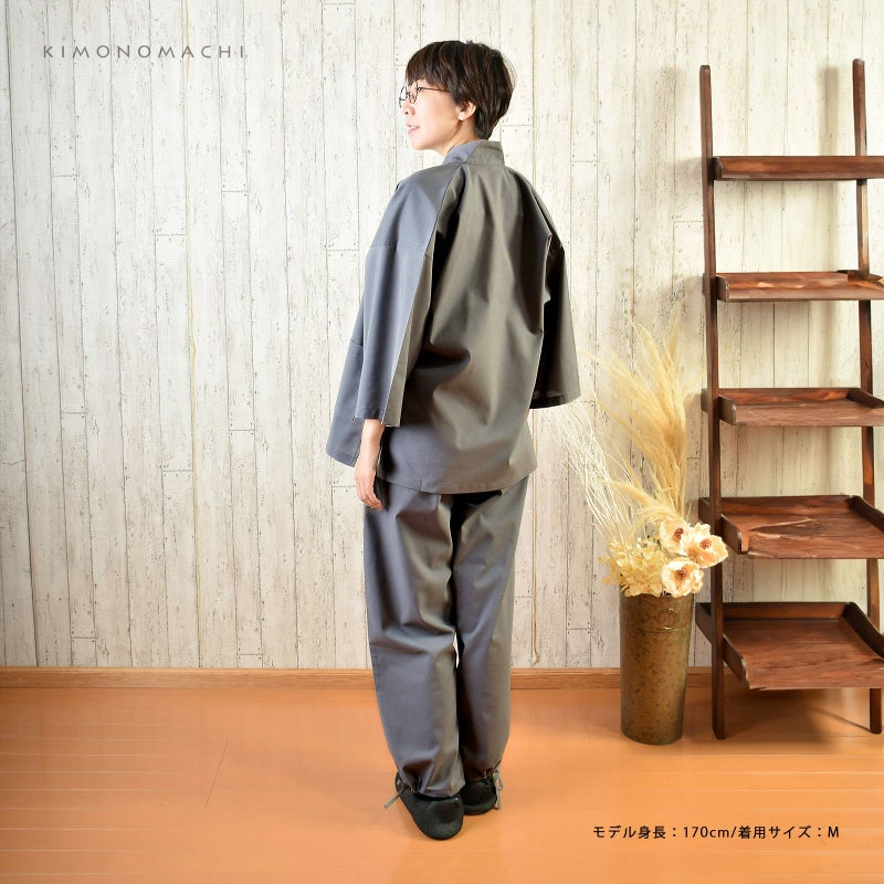 綿ポリ素材の、通年で着ていただける作務衣です。上着、ズボンの上下に分かれています。